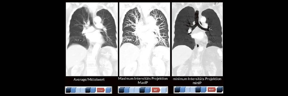 Darüber hinaus werden die unterschiedlichen MPR-Techniken wie z. B. Maximum Intensitäts- Projektionen (MaxIP´s) und minimum Intensitäts Projektionen (minIP´s) oft nicht routinemäßig angewendet. Dabei können verschiedene Pathologien durch den zielgerichteten Einsatz der unterschiedlichen MPR-Techniken oft viel einfacher und besser diagnostiziert werden.